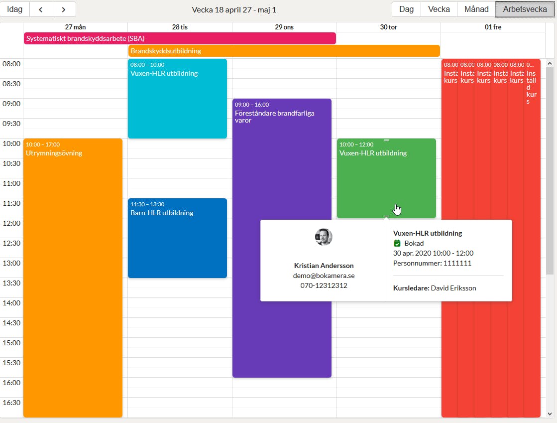 Käyttäjäystävällisellä yleisnäkymäkalenterilla näet helposti, kuka on varannut koulutuksen ja heidän yhteystiedot, kaikki koottuna yhteen paikkaan, sekä puhelimessa että tietokoneella. Voit myös perua koulutuksia, lähettää yksityisviestejä asiakkaillesi, lisätä koulutuksia ja blokata ajan, jos koulutus peruuntuu. Näin sinulla on kaikki hallussa varauksista.