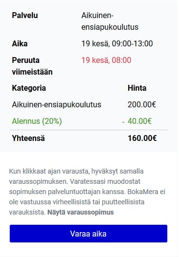 Haluatko toteuttaa koulutuksen? Ehkä koulutus pelastusalalla, matematiikan opetusta, koulutusta toisille yrityksille ja niin edelleen. Haluatko välttää stressin varausten hoitamisessa sähköpostitse tai puhelimitse ja mieluummin valmistautua koulutukseen? Voit hoitaa varaukset verkossa niin, että asiakkaasi varaavat suoraan siellä ja sinulla on täysi kontrolli aikataulusta. On helpompaa sekä sinulle että asiakkaillesi, kun he voivat suoraan varata ne osat, joihin haluavat osallistua ja lisäksi he saavat muistutukset hyvissä ajoin!